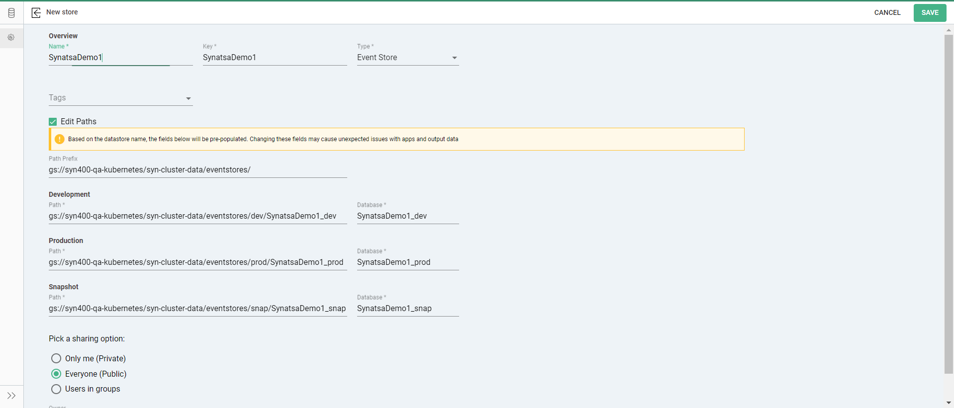It is important to note that once an app has utilized an event store for development, production, or snapshot purposes, the corresponding path and database names are locked for editing. This restriction ensures data integrity and prevents inadvertent changes to critical configurations. To clarify it further,