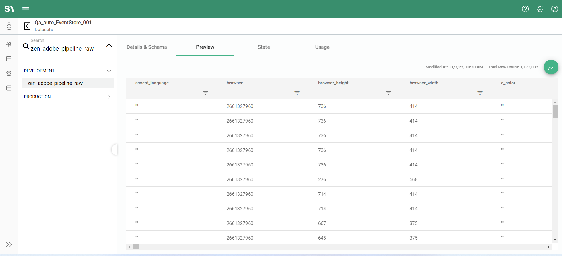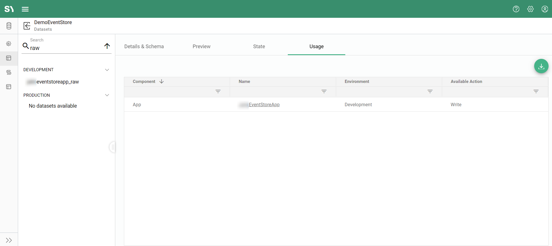 In the screenshot above, you'll notice several datasets listed under Development. This occurrence is due to the utilization of the event store by the 'AA Loader' app process for the development workflow. Typically, these datasets are prefixed with the application's key value ('demoapp_eventstores' in the provided screenshot). Once the application employs the event store for the production workflow, you can expect datasets to appear under Production as well.