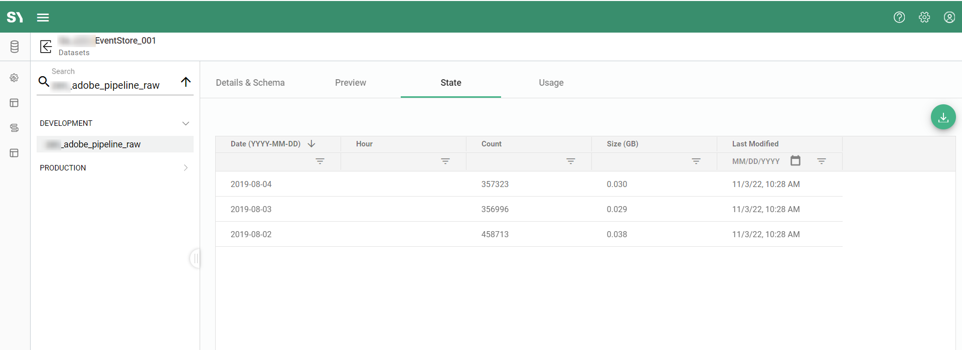 On the 'State' tab, you can review the size and count of the data that was fetched into the dataset at specific times. The 'State' tab displays the following five columns: