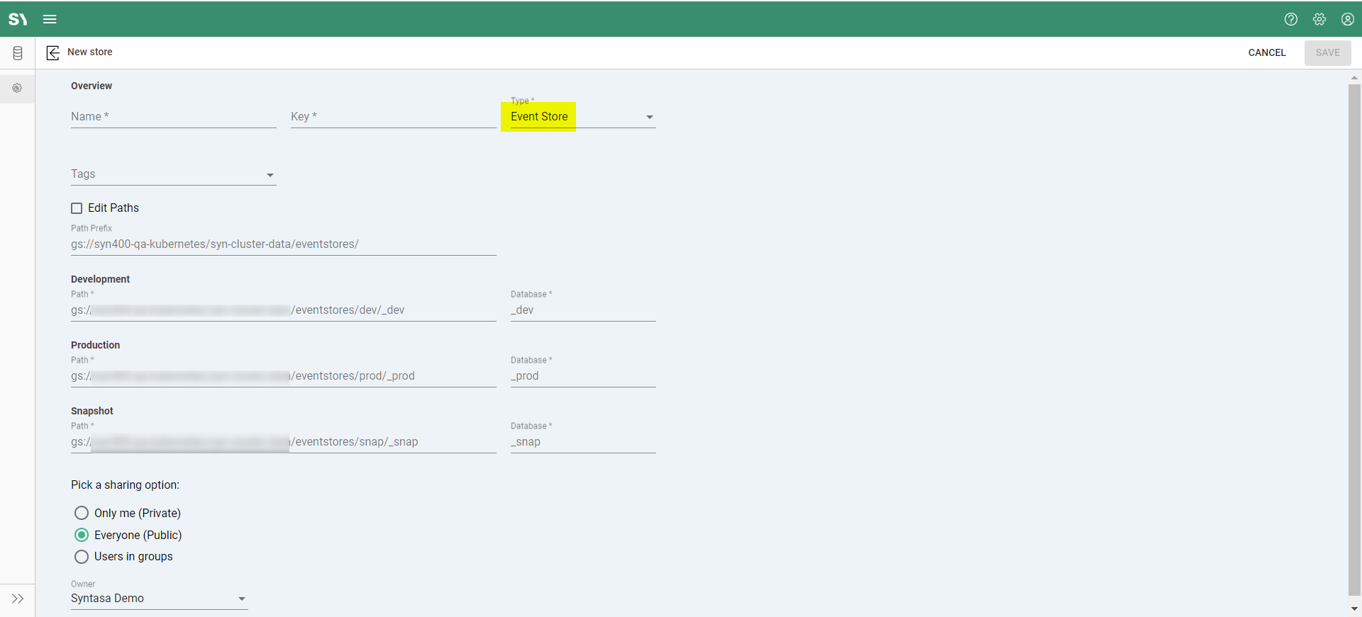 • Production Database (prod): The production database is the operational backbone of the Event Store, housing the finalized configurations and settings utilized in live environments. Data stored in the production database is actively used by Syntasa applications to deliver real-time insights and analytics.