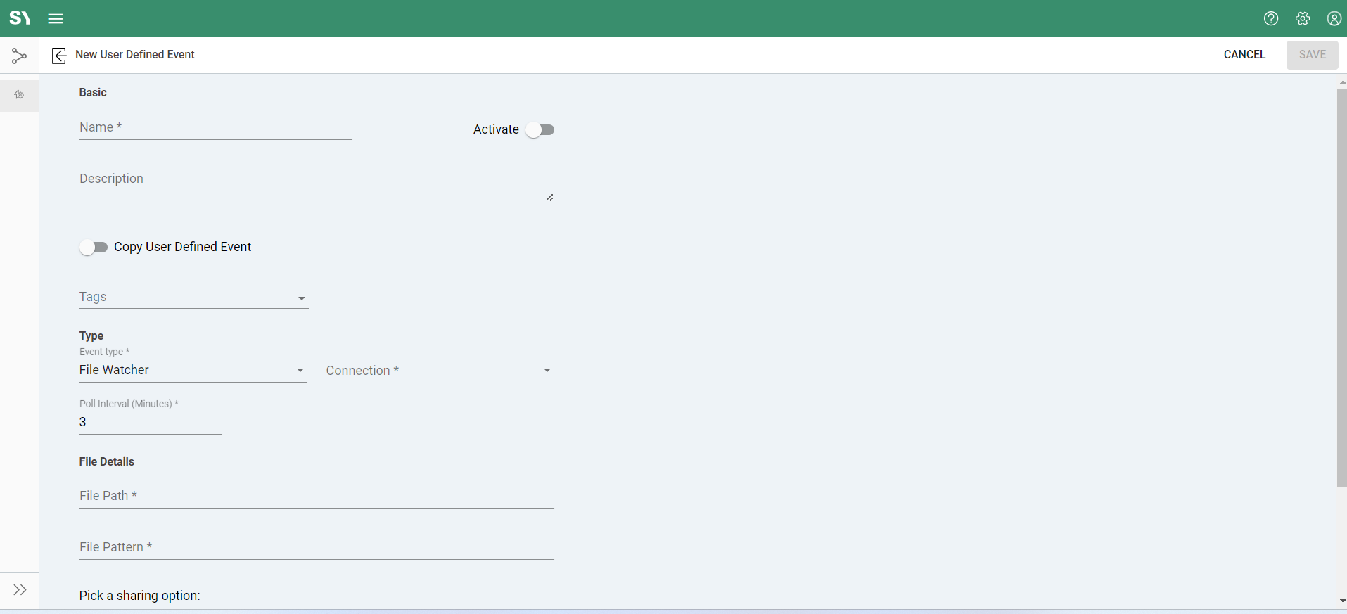• Active/Inactive: When the toggle is set to active (usually indicated by a green button or checkbox), the file watcher monitors the specified file path and file pattern for changes.