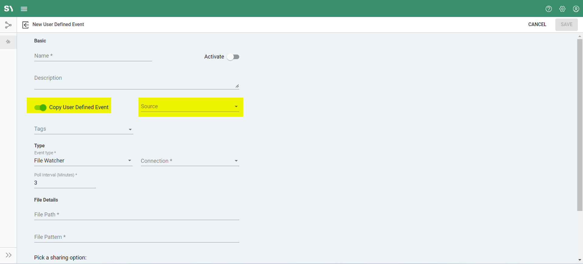 • Poll Interval (Minutes): This setting determines how often the event should check for new files, with a value of 1 indicating a check every minute.