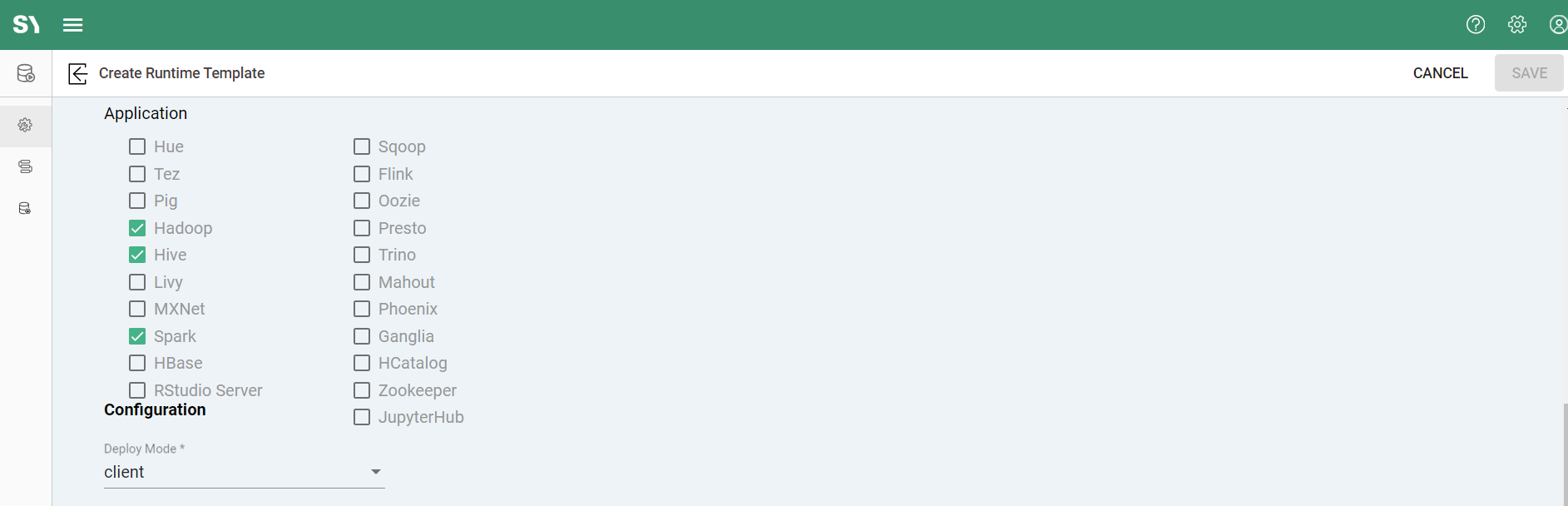 Application: There are several applications that can be utilized with the AWS EMR Cluster runtime. Checking the associated checkbox will enable the feature(s) on new cluster instances of the runtime template.