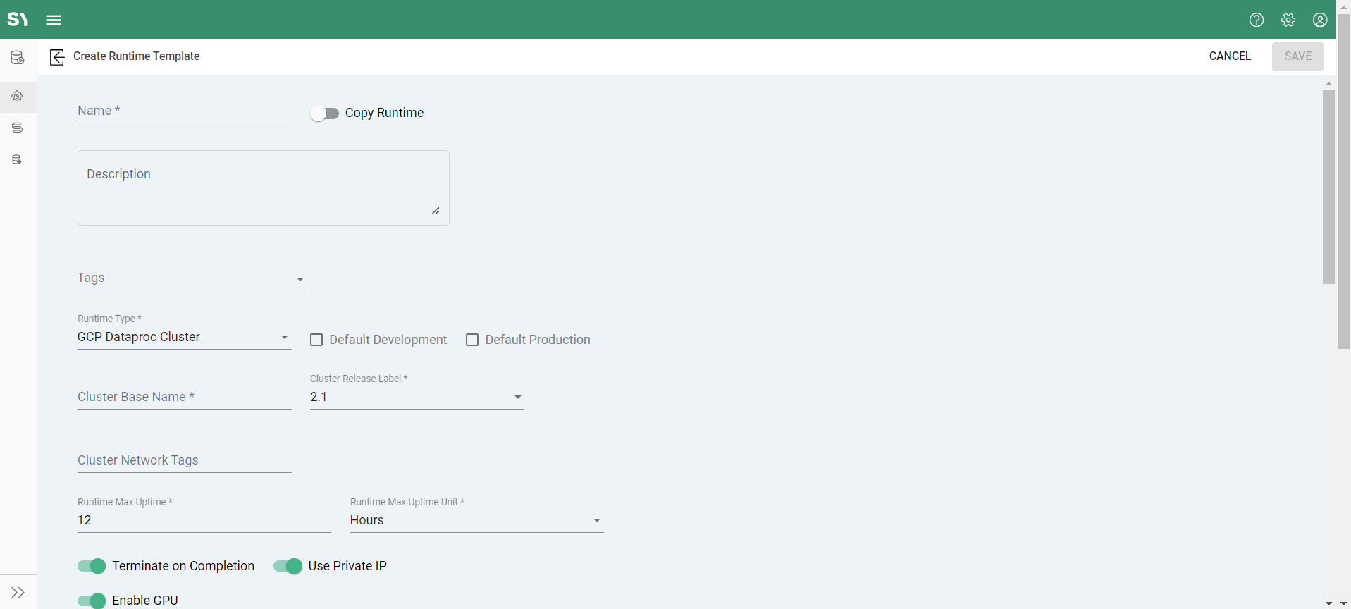 Available in Syntasa environments installed in GCP, the GCP Dataproc Cluster runtime type utilizes the cloud service to run jobs, execute code in notebooks, etc., and have all the various settings seen in the cloud service.