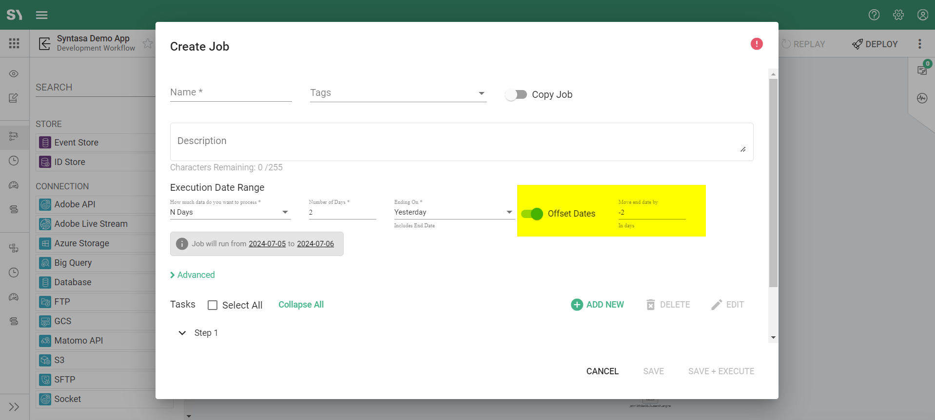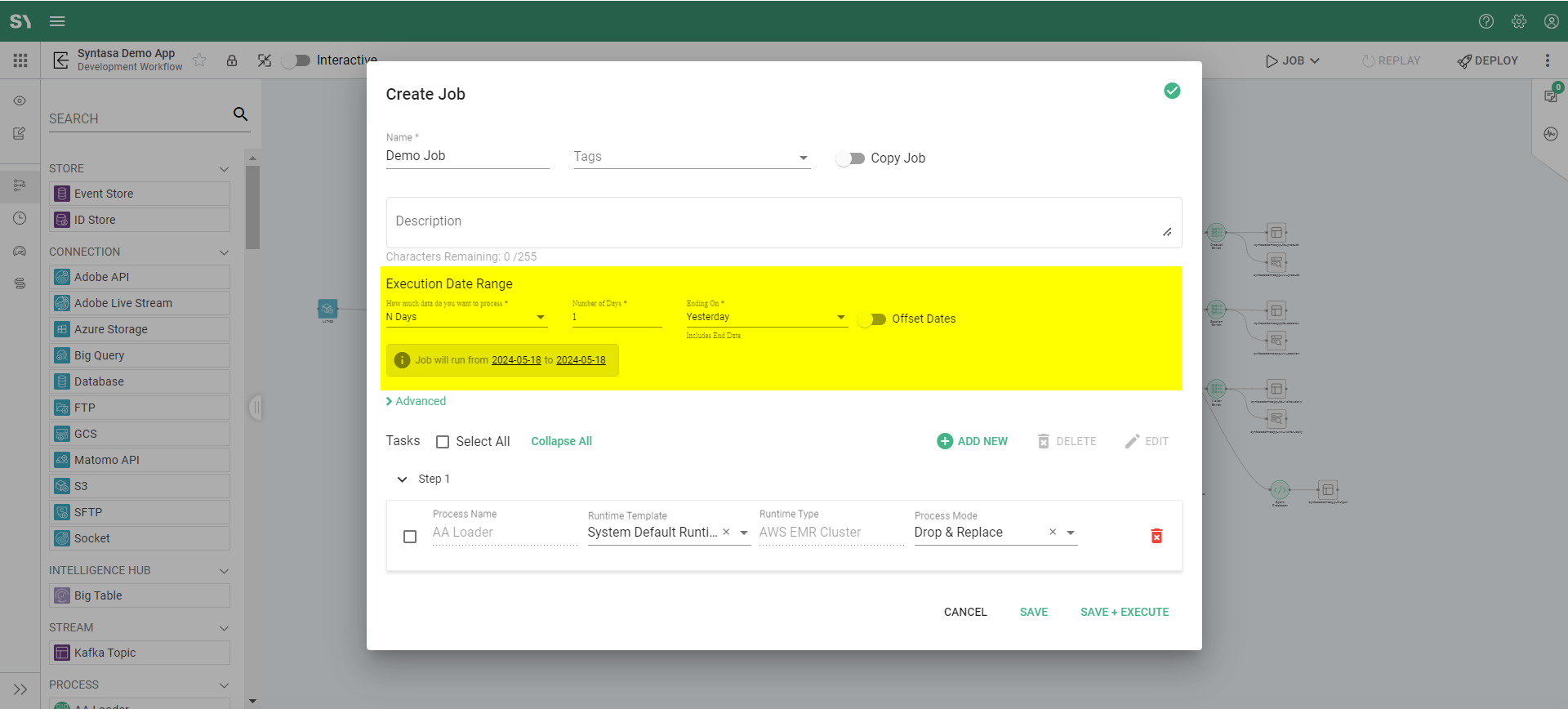 9. Once the first step is added, you will find a new section called 'Execution Date Range' with date fields. This date range specifies how much data you want to process. More information on 'Execution Date Range' can be found here.