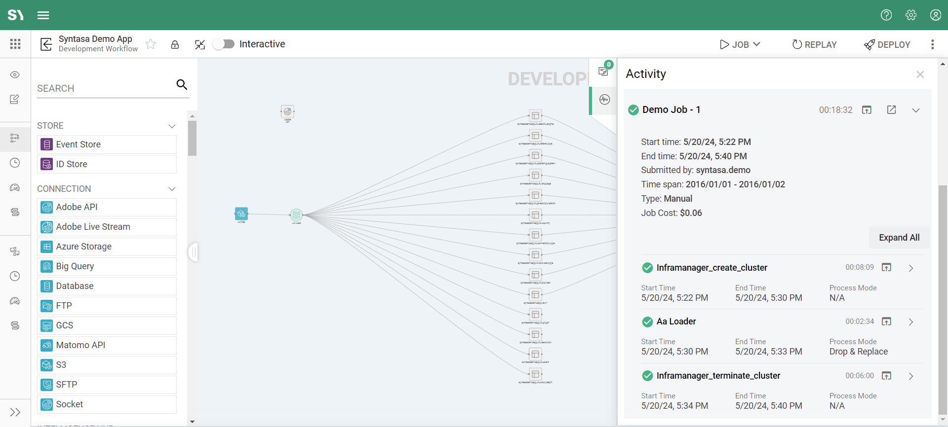 We can expand each step to see its details. Generally, you will see 'Inframanager_create_cluster' as a first step when the cluster is not running. It creates the cluster and allocates the resources according to the runtime template selected. As the last step, you can see 'inframanager_terminate_cluster' if the runtime template has been configured to terminate after each job execution.