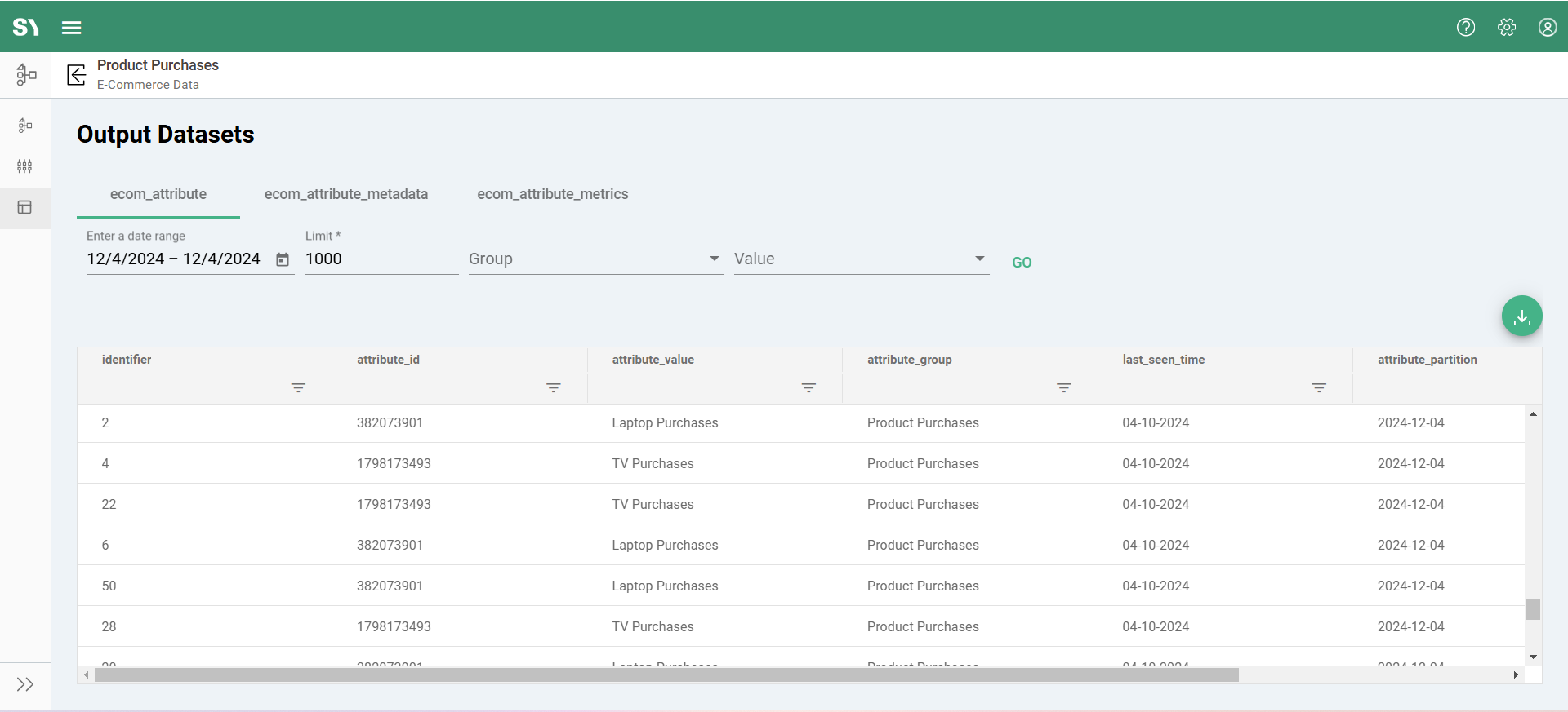 The example screenshot below shows a preview of data from the Output Datasets screen within the attribute group. In the first row, a Visitor with ID 2 met the condition for the attribute "Laptop Purchases" under the attribute group "Product Purchases" on December 4, 2024.