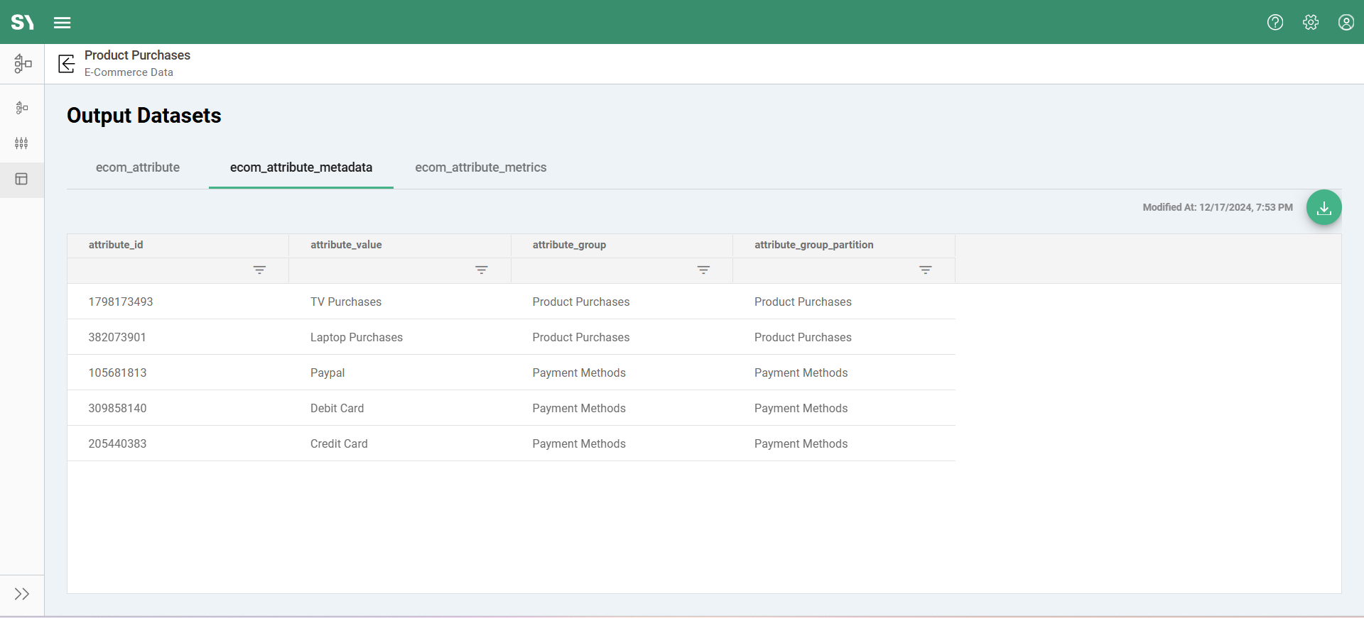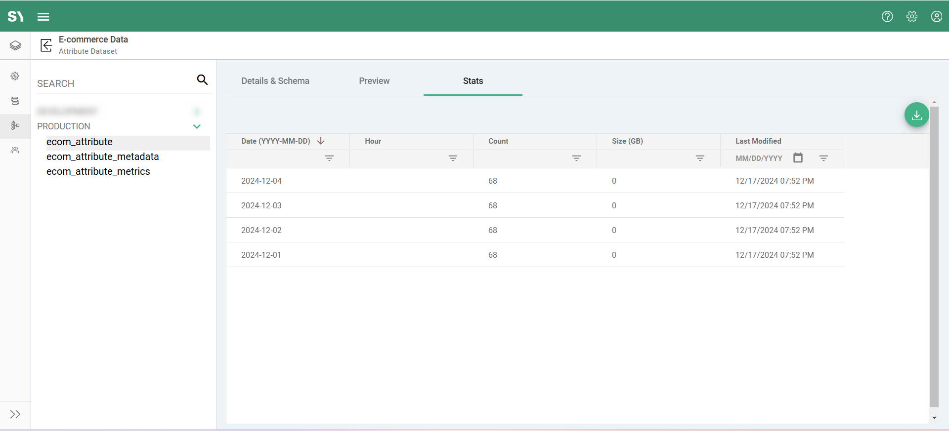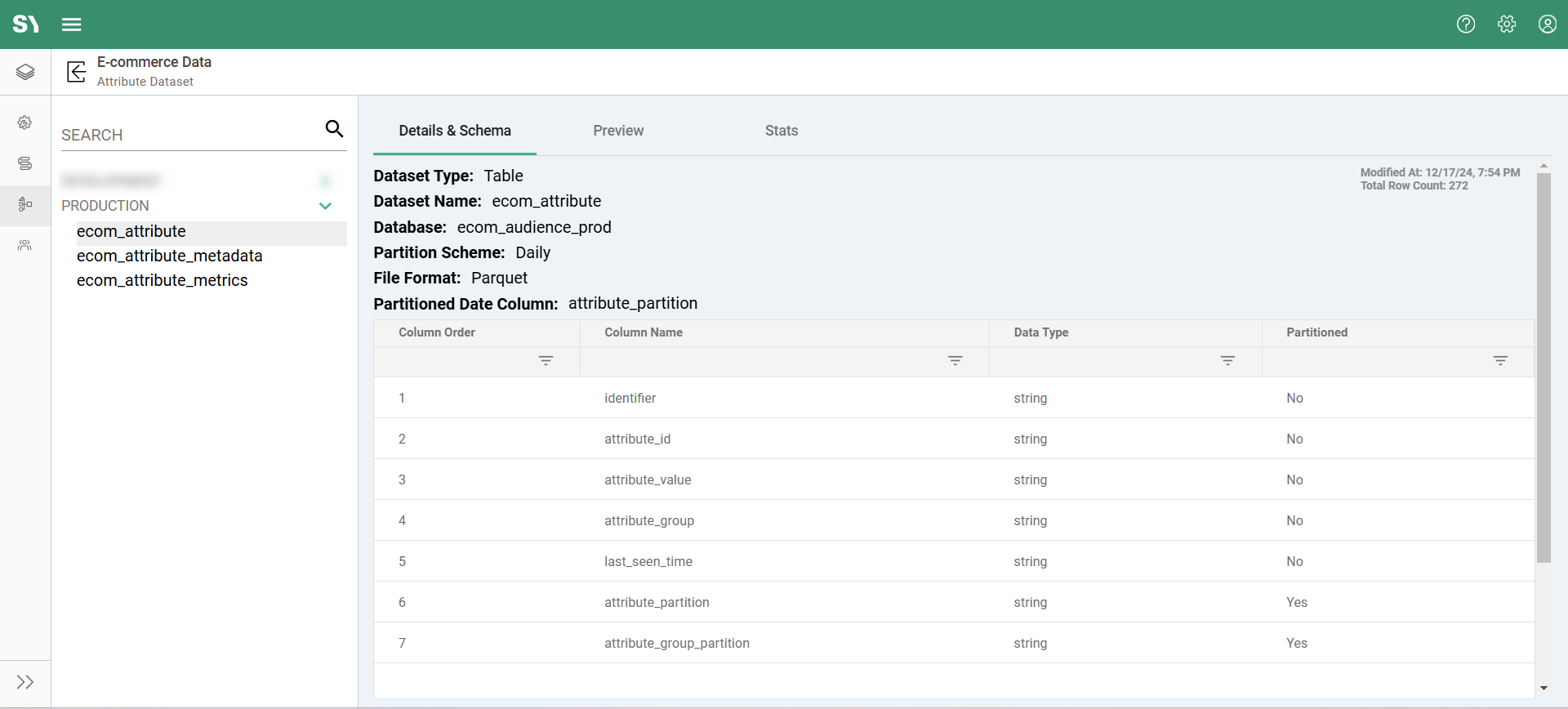 We can access more details about the output datasets like Details, Schema, Preview, and Stats under the Data Layer screen. Follow these steps to navigate to the Attributes Dataset screen under Data Layer: