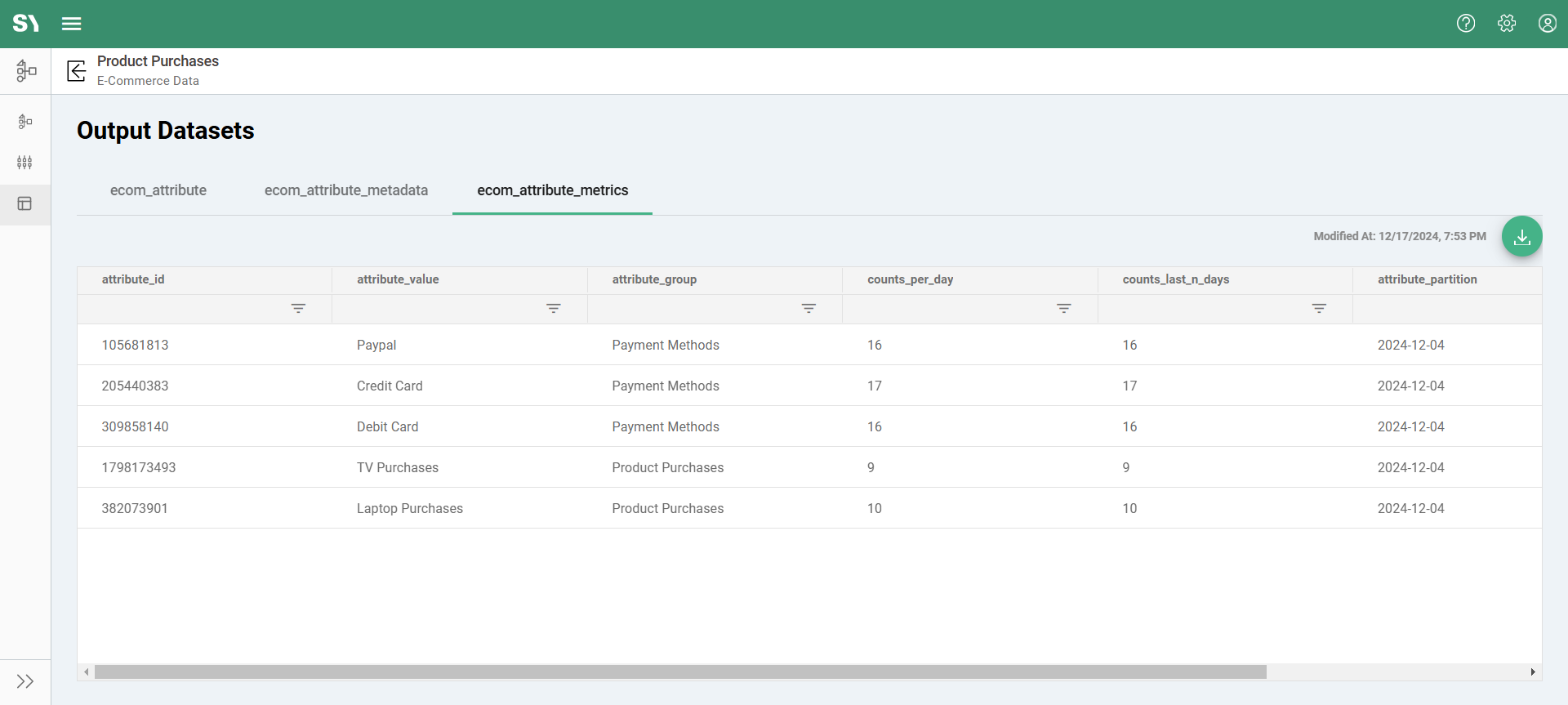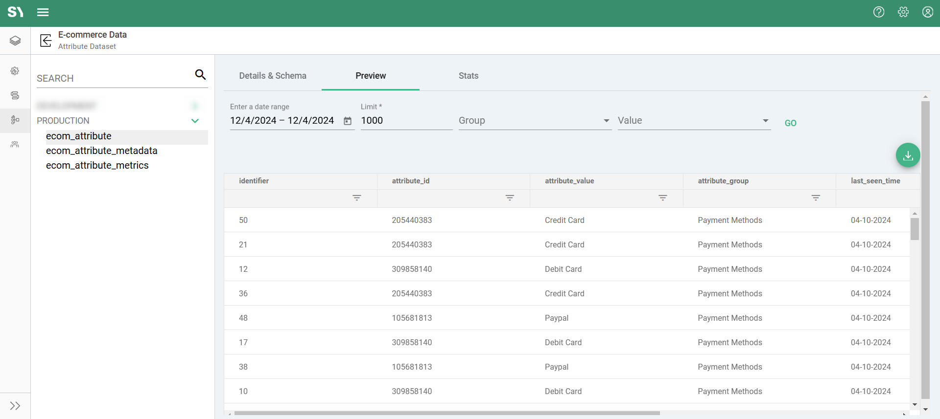 As the name suggests, this section provides a preview—displaying a limited number of results from the selected dataset. The data can be sorted and filtered within the application or downloaded as an XLSX file for external review. However, the download is limited to the data shown in the preview screen. The Preview section is also available on every Attribute Builder page and Datasets screen under the Audience module.