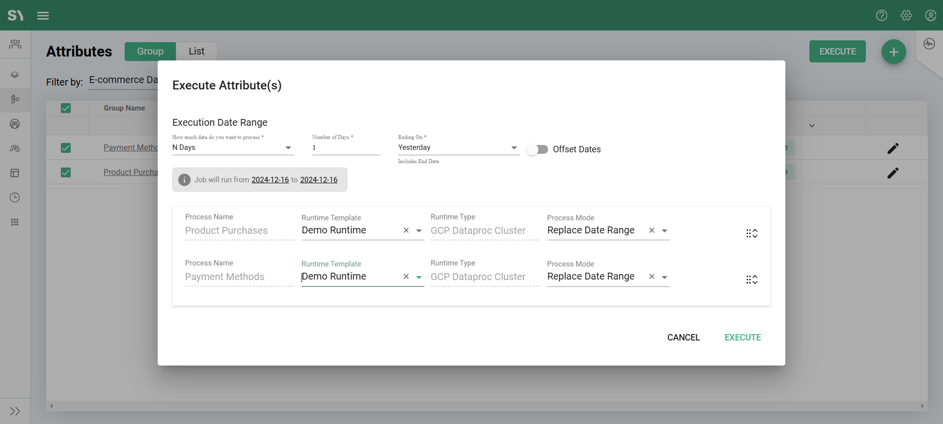- Click the 'Execute' button. This will open the Execute Attribute(s) pop-up window, which displays the selected groups as steps.
