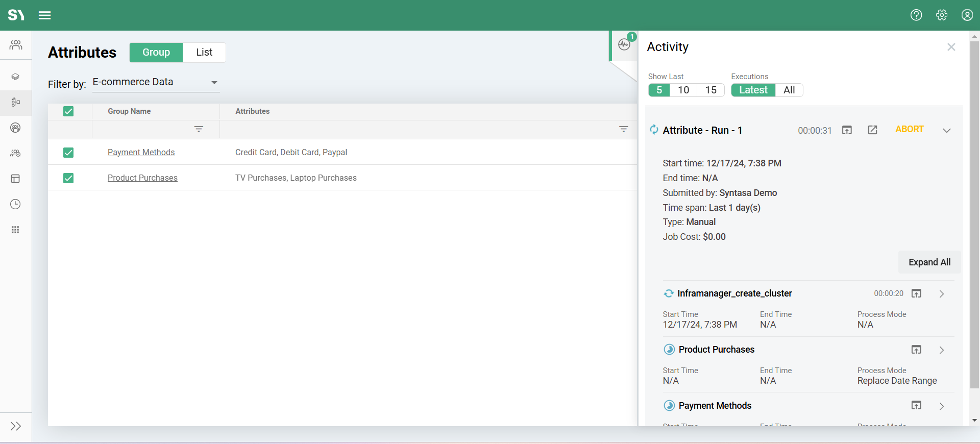 - When you run an ad-hoc job for the first time (from the Attribute List or Attribute Builder), a job named Attribute-Run is automatically created under the app where the execution occurs. Subsequent executions will use the same job but with a different execution ID. The execution details and history of ad-hoc jobs can be viewed on the Operations screen.