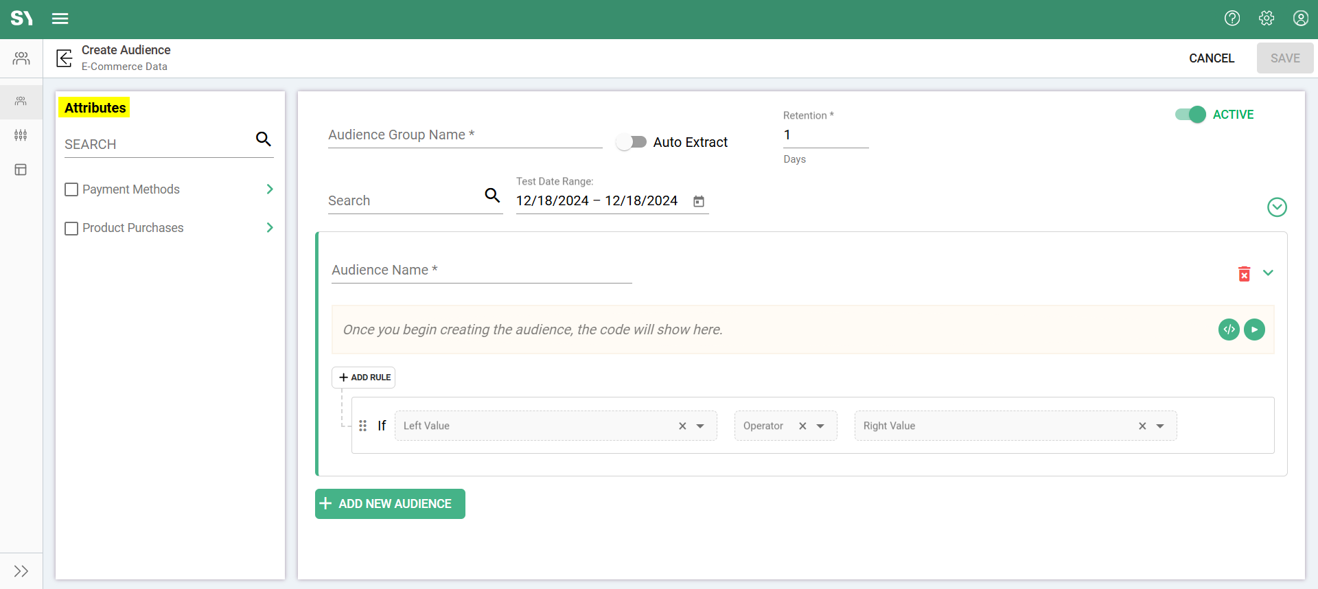 In this article, we'll guide you through the process of manually creating an audience group, where you'll define attributes by setting specific rules. If you're looking to create an attribute group using the auto-extract feature, please refer to the article Creating Audience using Auto Extract. Now, let's dive into the key fields and steps required to manually create an attribute group.