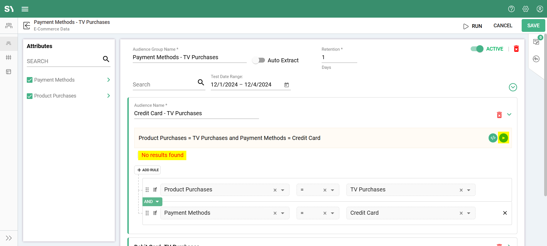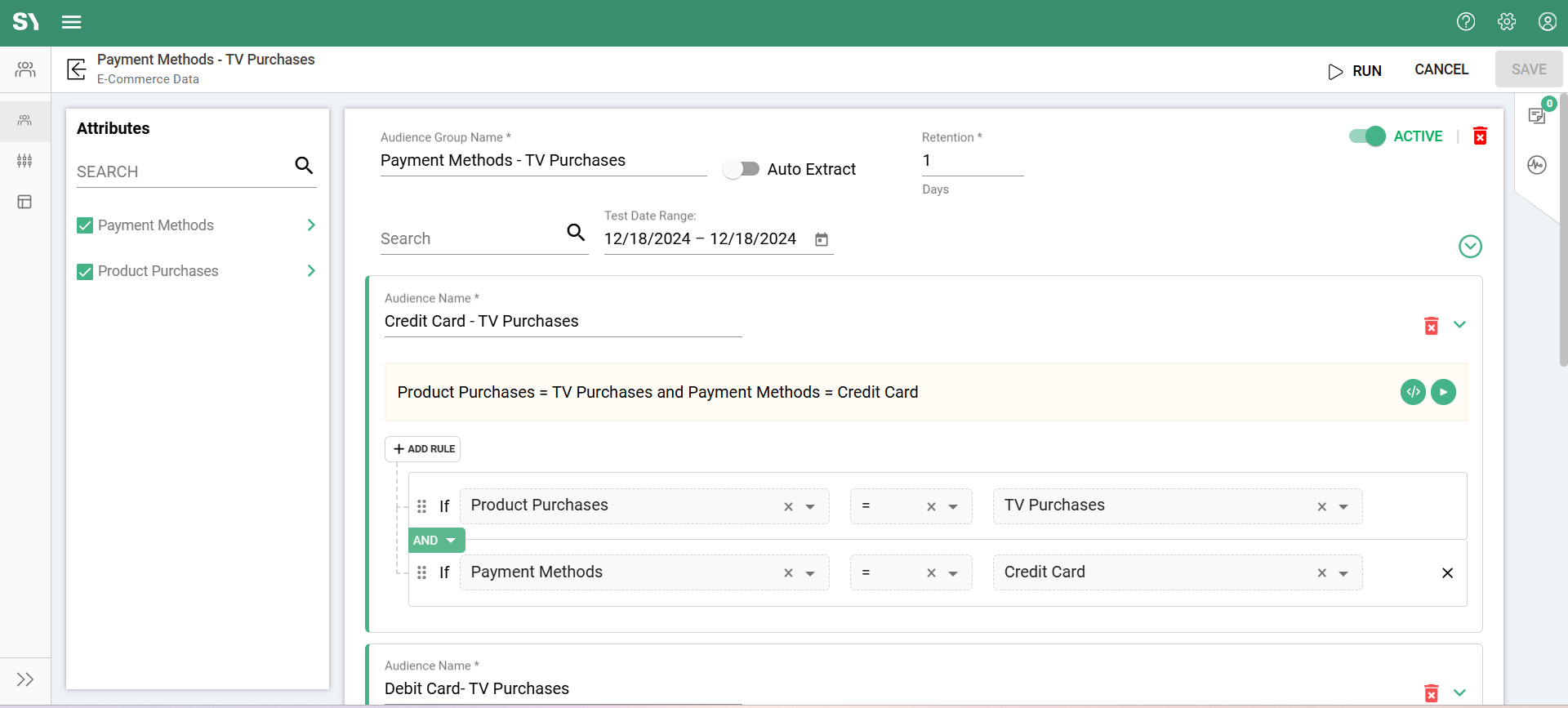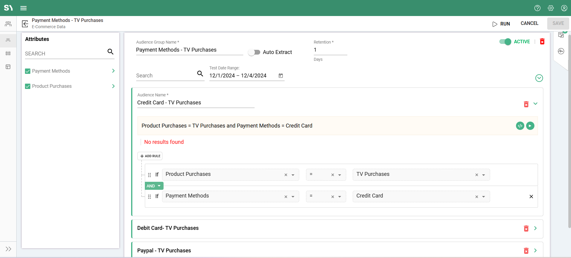 The TV purchase data resides under the Product Purchases attribute group, while payment details are found in a separate attribute group. By applying an AND rule condition, you can combine the attributes to create an audience for each payment method used to buy a TV. This allows for precise targeting of users based on both their purchase and payment behavior.