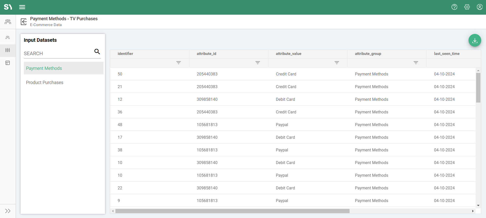 The Audience Builder screen includes two additional screens—Input Datasets and Output Datasets—accessible from the left side menu. The Input Datasets screen provides a preview of the input data with limited records, which can serve as a reference for decision-making when creating an attribute.