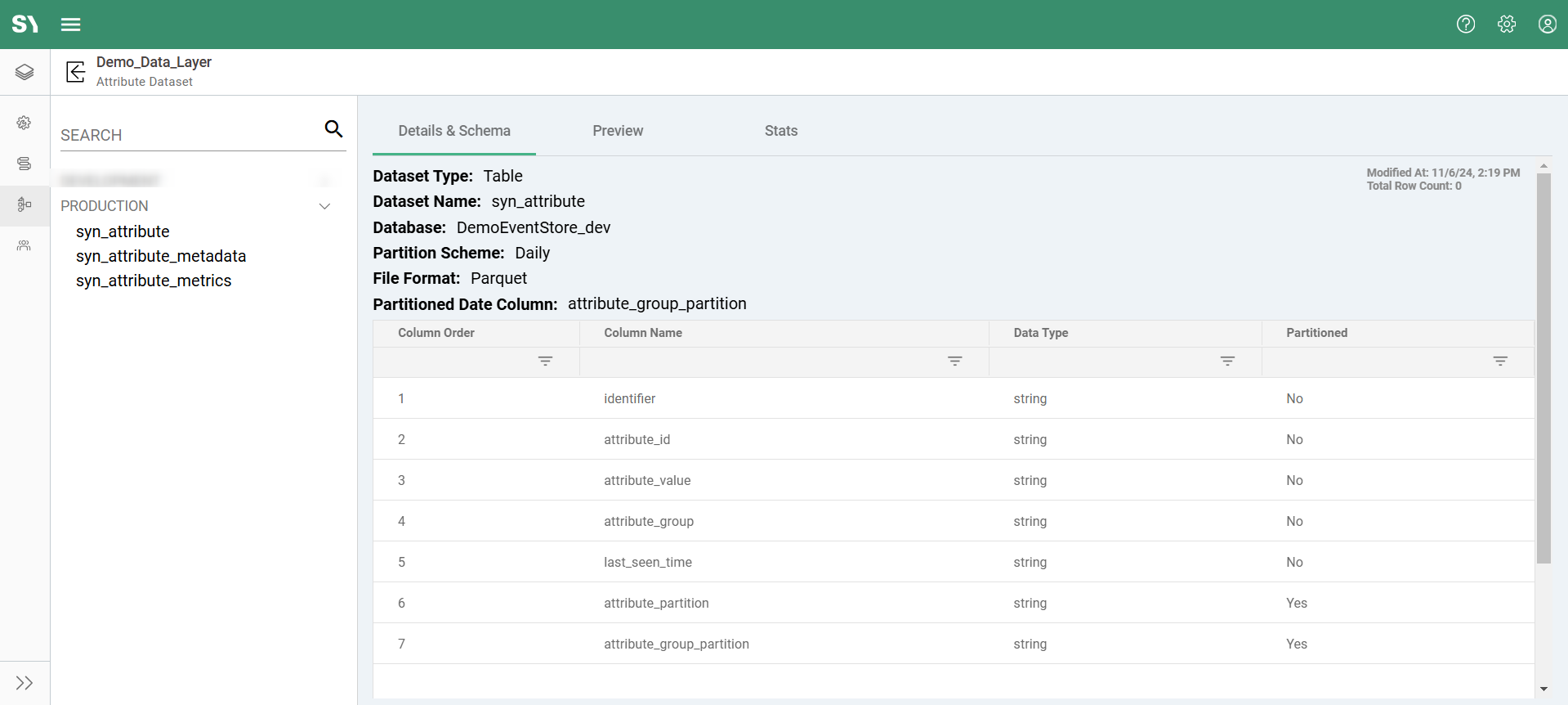 • Results Table (syn_attribute): Contains unique identifier values for each attribute condition met, partitioned by date.