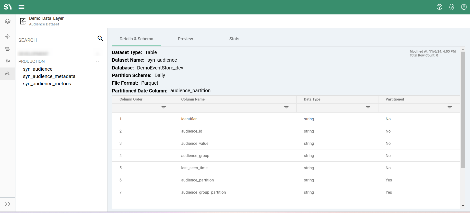 • Metadata Table (syn_audience_metadata): Stores unique audience values for all audience builder apps in the data layer.