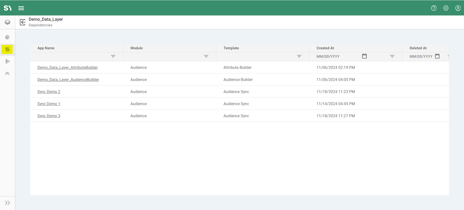 Within a data layer, several pages are accessible via the left navigation bar. The apps that are created in background on top of the data layer can be seen in the Dependencies menu via the dependencies icon (Dependencies_Icon.png).