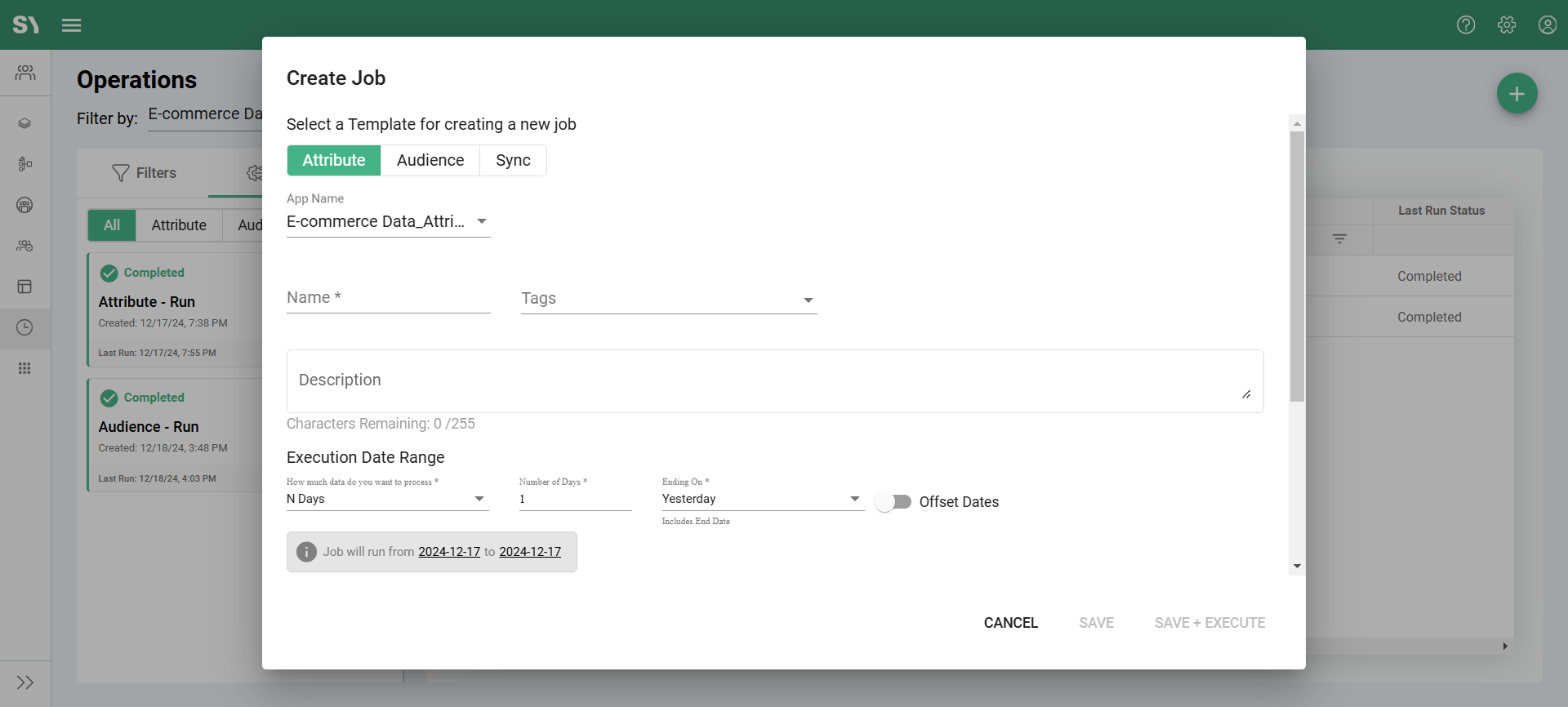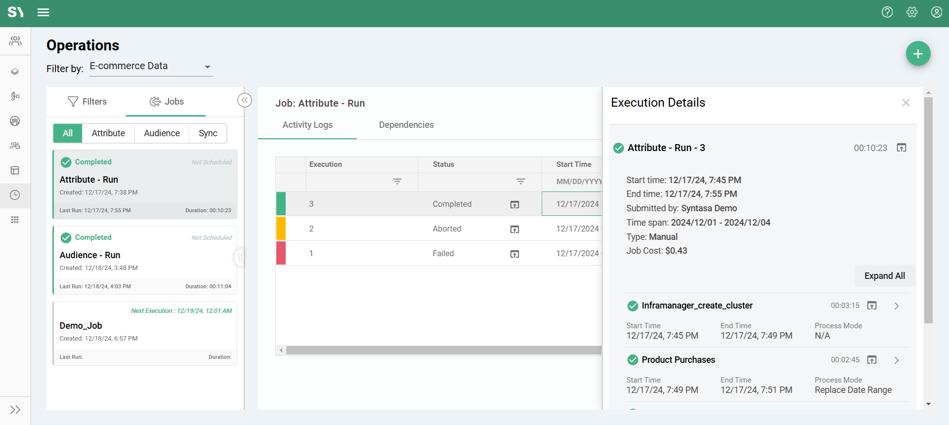 The Operations screen provides a comprehensive view of all job activities within the selected data layer. It enables users to create and schedule jobs for attributes, audiences, and sync apps. Additionally, users can easily track job activities, review historical job executions, and configure existing sync jobs.