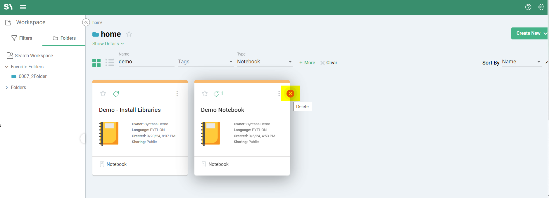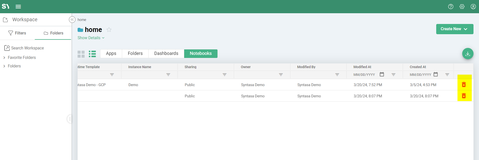 To delete the notebook from the list view, horizontally scroll to the right side, and it will show you the 'delete' icon in the last column.