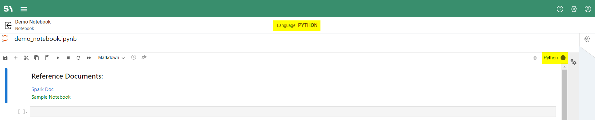The Language field in the header of the notebook screen reflects the programming language value set during the creation of the notebook. This value can be altered by editing the notebook; however, the notebook itself must be refreshed for this modification to be applied. Additionally, it's important to note that any code already written in the notebook will require refactoring if the language of the notebook is changed.