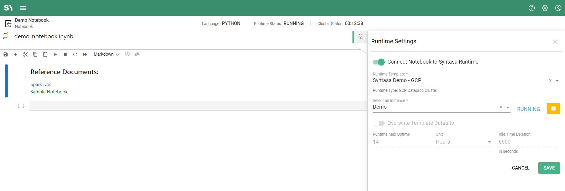 Syntasa Runtime can be enabled while creating the notebook or editing the notebook or on the JupyterHub screen. Once the runtime is enabled or saved on any screen, it will automatically reflect on the other two screens along with the runtime status i.e. Running or stopped. To check the attached Runtime details or enable the Syntasa Runtime on the JupyterHub screen, click the gear icon (Gear_Icon.png) shown on the left side.