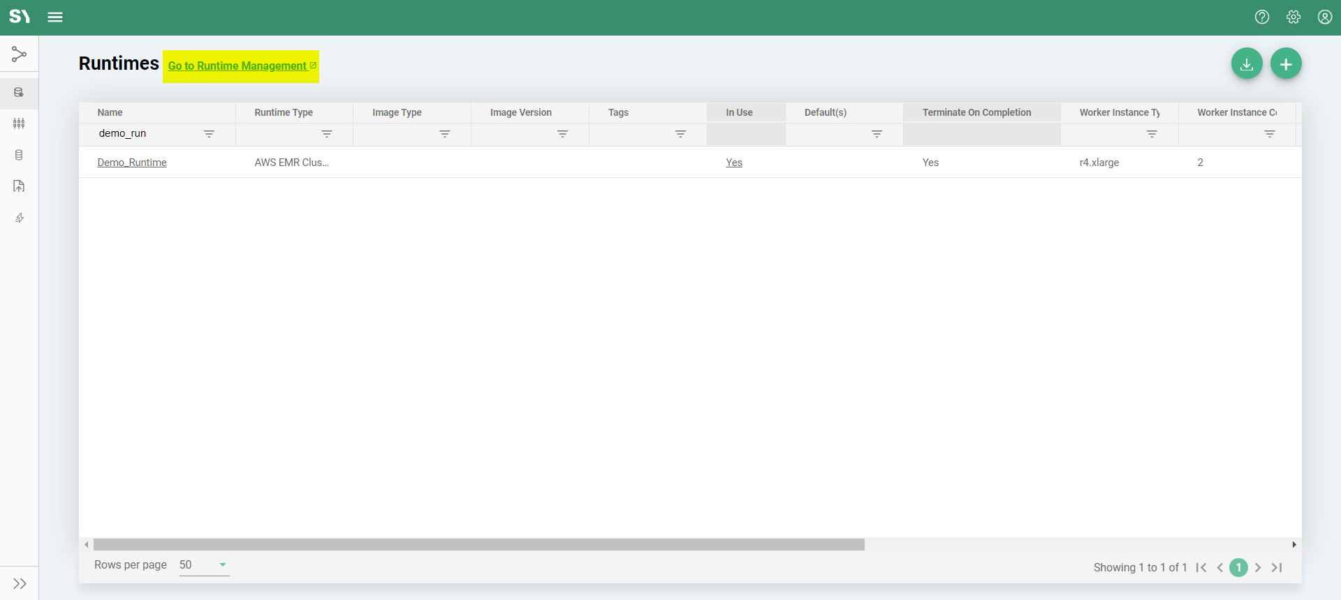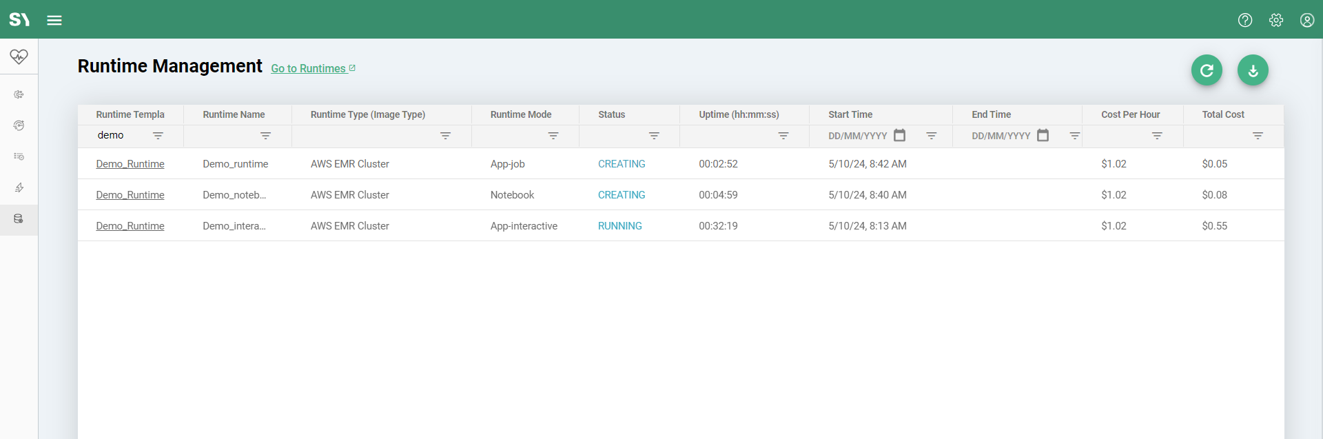 - When a new instance is created under Interactive Mode, it generates a new entry in the Runtime Management Screen, displaying instance details regardless of the number of jobs run using the same instance. You can execute any number of jobs using the same instance, with the screen aggregating the costs incurred for each job.