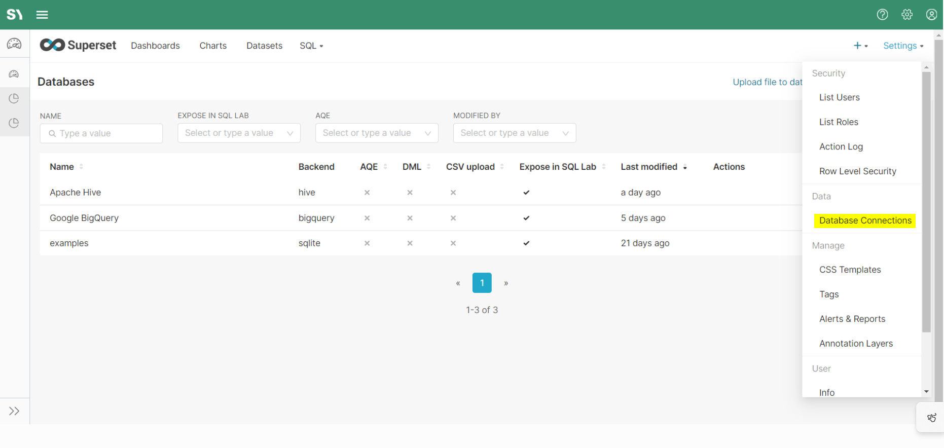 From the upper menu, click on the Settings dropdown link in the upper right corner and select the Database Connections option under Data. Here you will see the existing database connections that have already been configured and are available to be used.