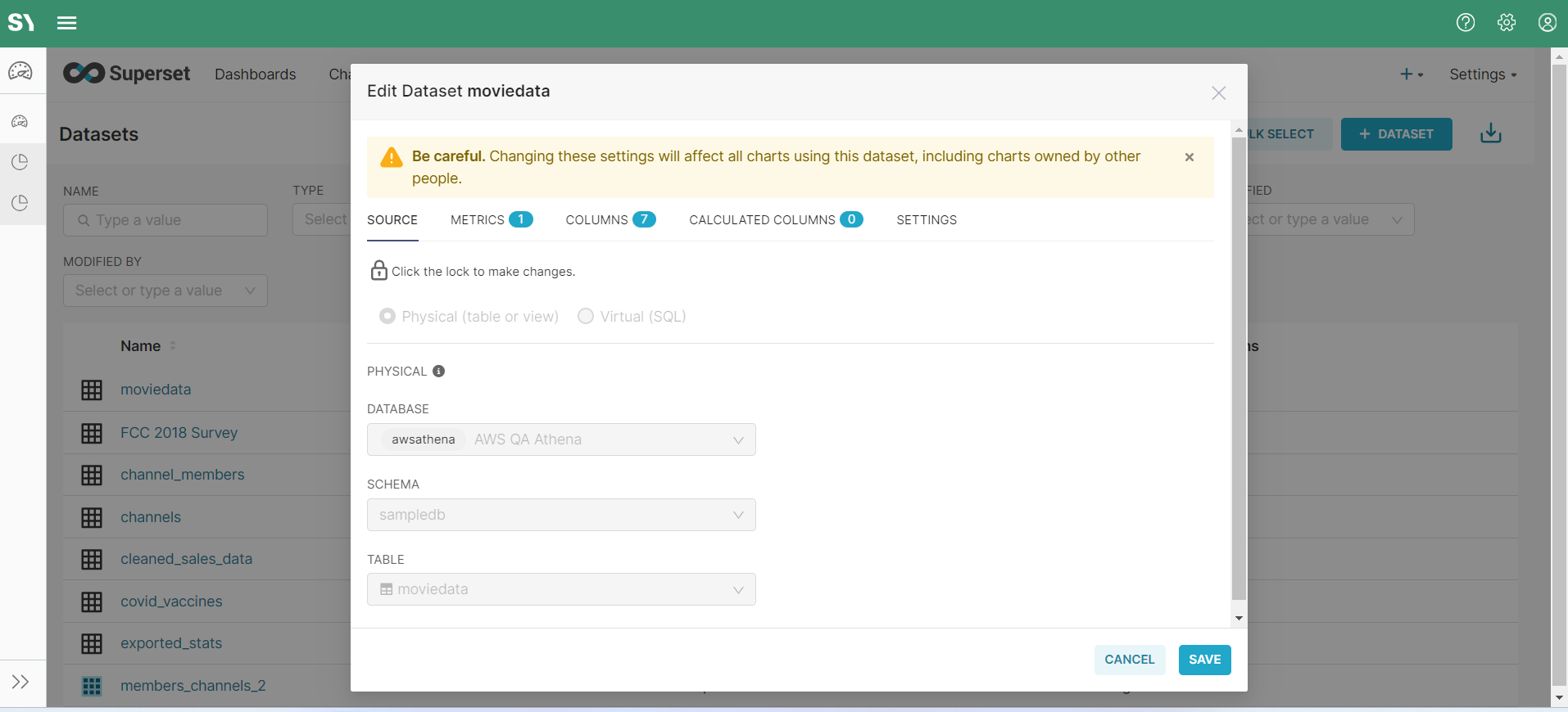 Once a dataset is created, you have the option to customize its properties and behavior. This includes configuring column settings to apply specific controls and customizations for how the columns are utilized within Superset charts and dashboards.