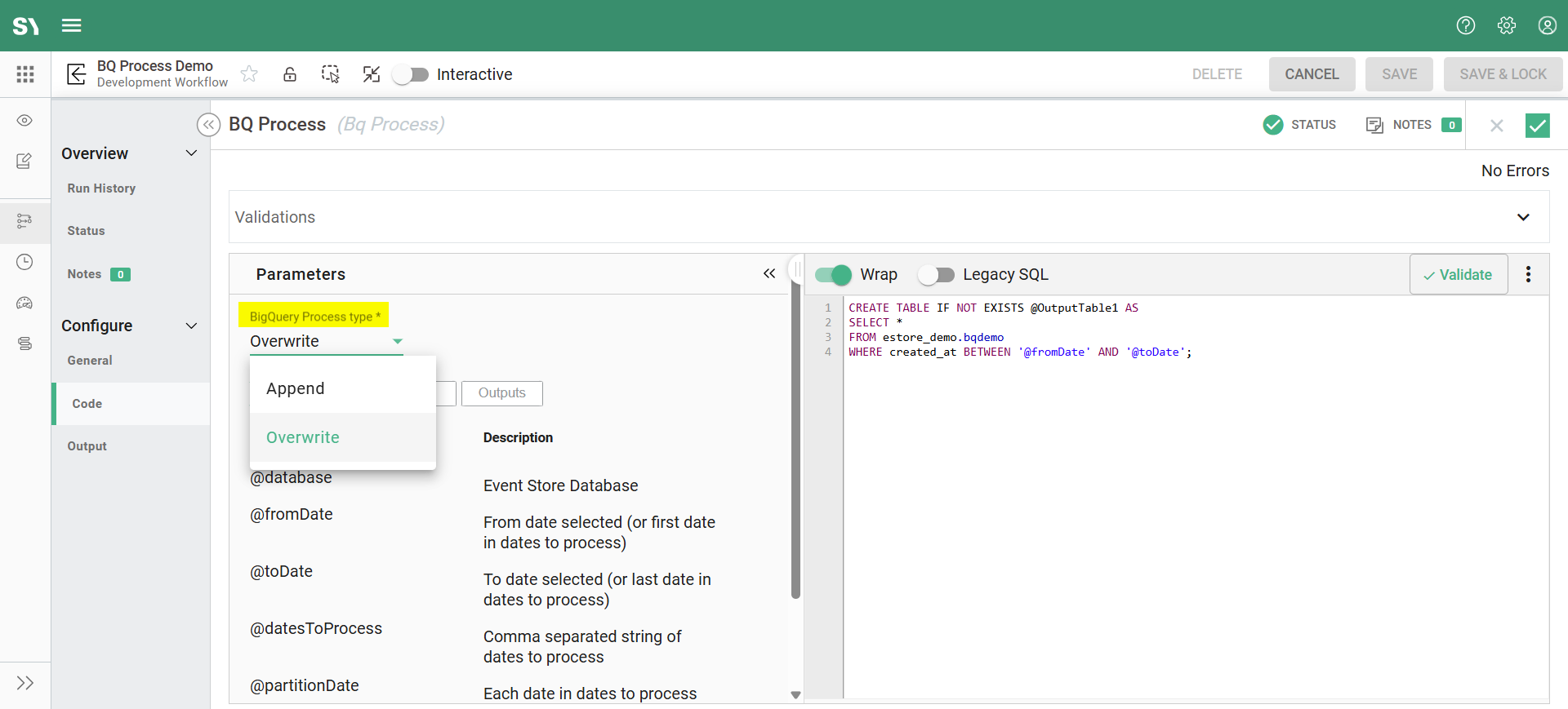 In the Parameters section, you will find a dropdown named BQ Process Type, which offers two options: Overwrite and Append. By default, the value is set to Overwrite. Each option serves a distinct purpose: