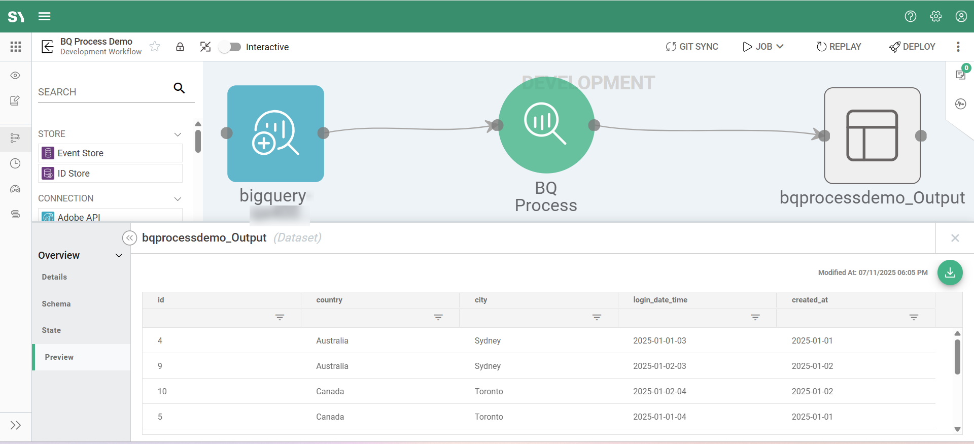 Click on the Output node of the BQ Process to open the Preview tab. This tab displays the first 100 records of the output table, allowing you to quickly confirm that the transformation and data loading have been completed as expected.