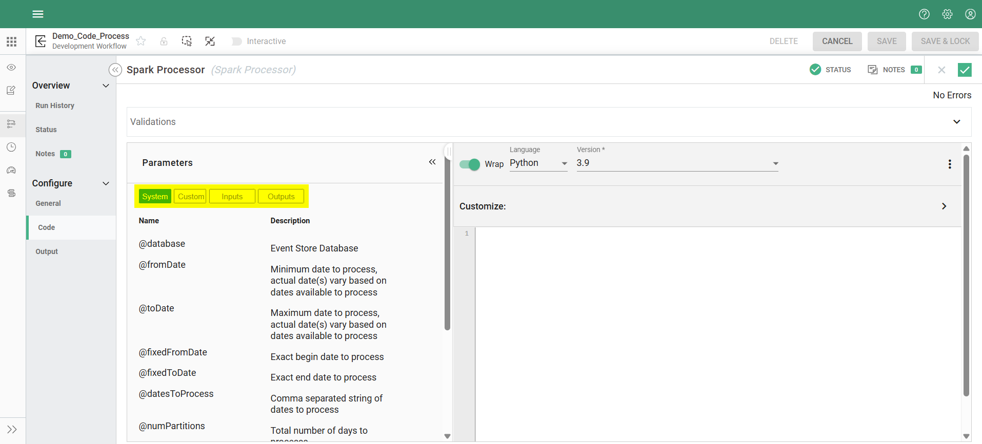 Syntasa offers various process types, including those where users can write custom code in languages like SQL, Python, Scala, or R. These "code processes" are fundamental to building custom analytics datasets and solutions. To make these code processes flexible and adaptable, Syntasa utilizes parameters. Most commonly used code processes are the Spark processor, the BQ process, and the Code Container process.