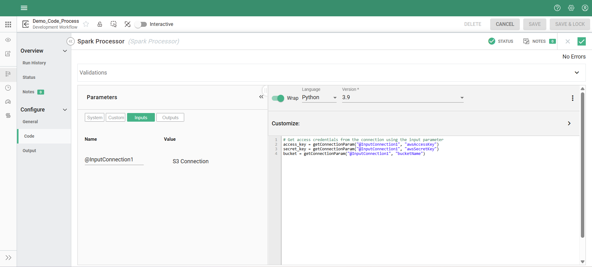 Let’s say you have connected an S3 connection to a Spark processor. Instead of hardcoding the access key and secret key, you can retrieve them using the input parameter.