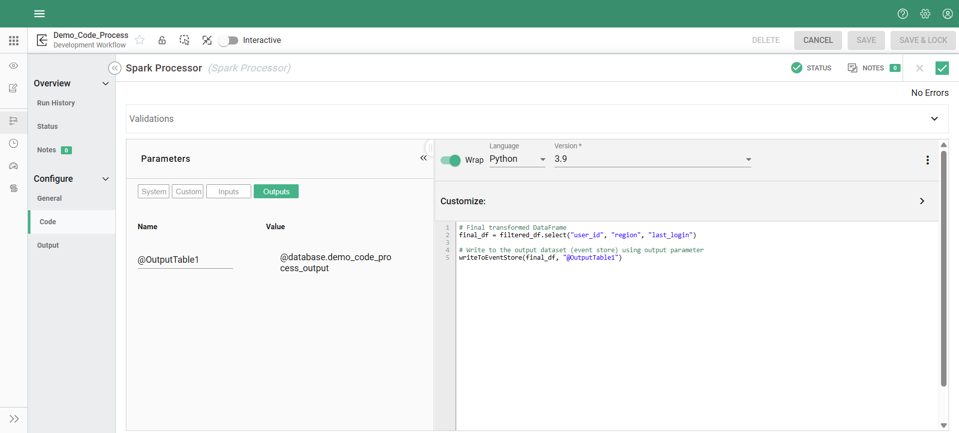 Let’s say you’re transforming user data in a Spark processor and want to save the cleaned result to a configured event store table. You don’t need to manually reference the dataset path—instead, you can use the @OutputTable1 parameter directly.