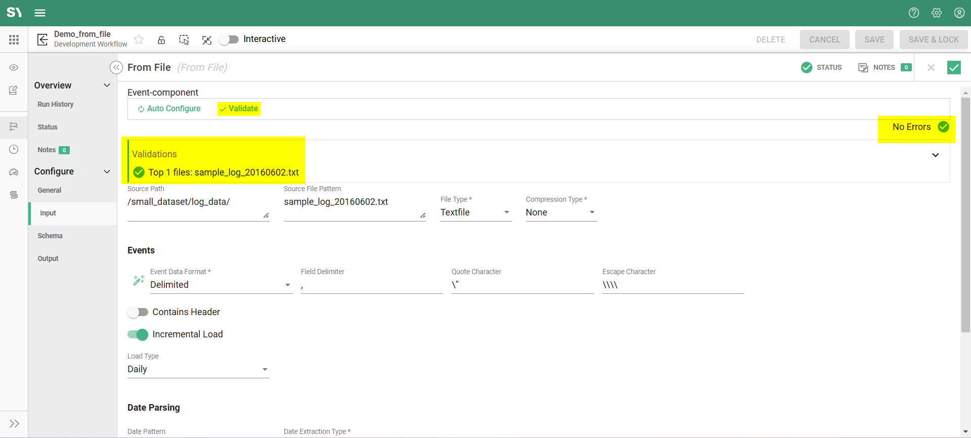 After specifying the source file path and pattern, click the Validate link to confirm whether the system can detect the file(s) based on the provided configuration. If successful, the detected file names are displayed without errors. Otherwise, any issues are highlighted in the Validation section.