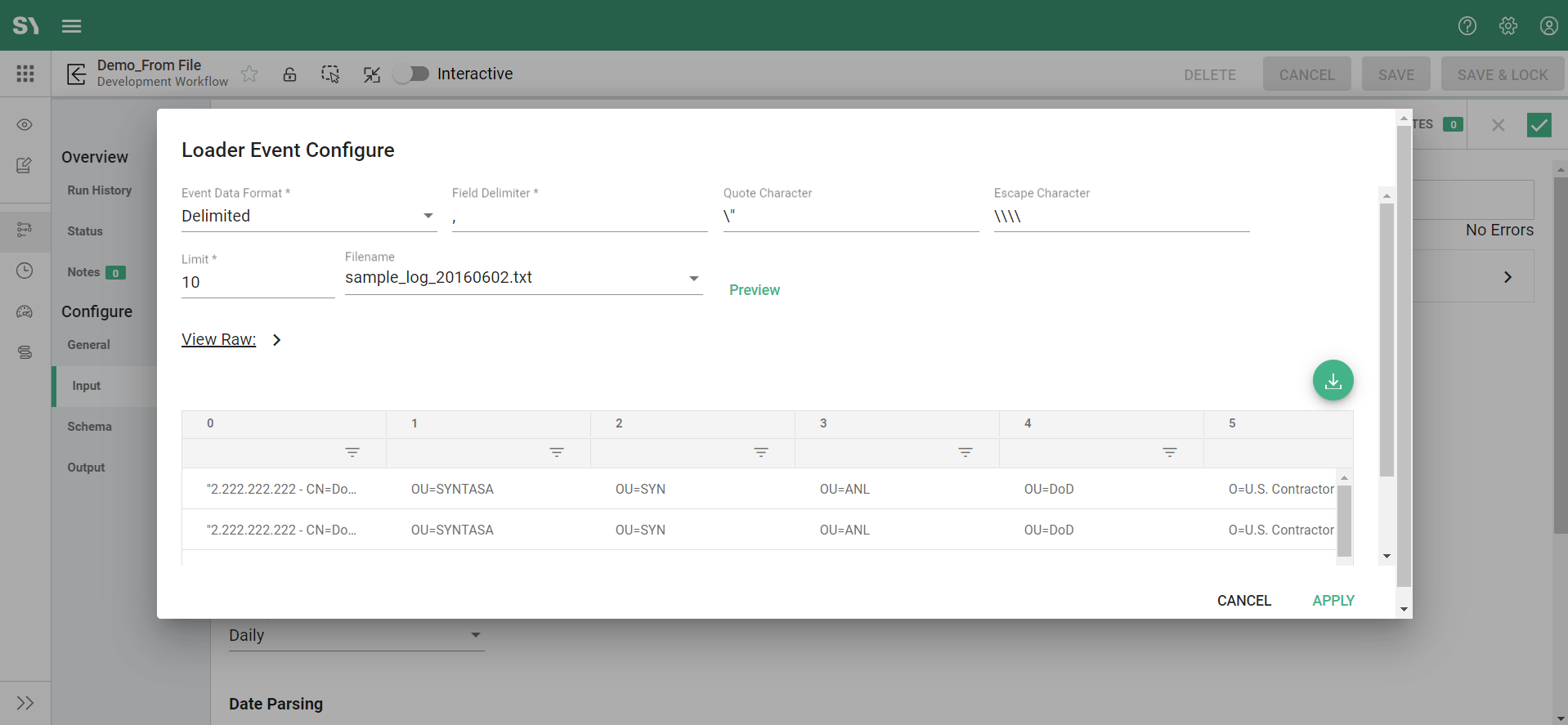 ) feature enables users to preview event data by specifying the event data format and field delimiter values. This preview feature provides a raw data table view, allowing users to determine the appropriate parameters for the event data format based on the previewed data.