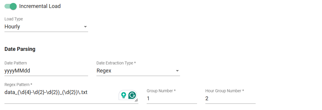 If the load type is Hourly, an additional field is available: - Hour Group Number: Identifies the regex group number for extracting the hour.