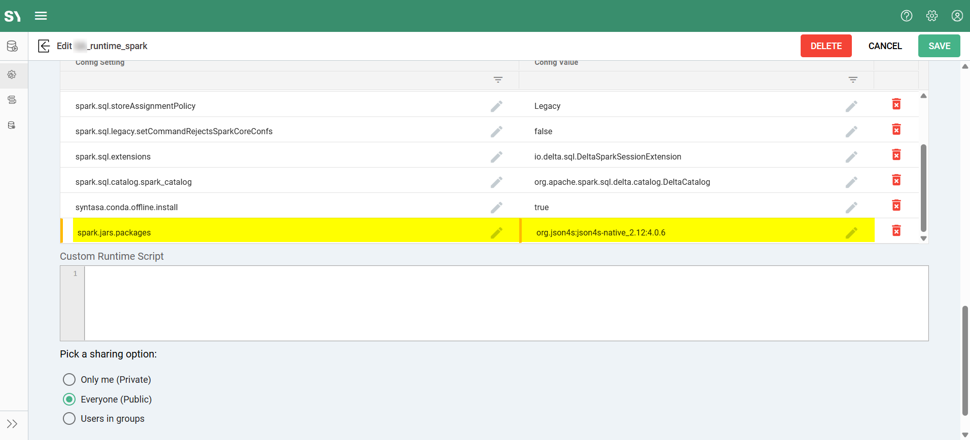 2. Add the following Spark configuration property: spark.jars.packages=org.json4s:json4s-native_2.12:4.0.6 (This tells Spark to download and include the json4s-native library version 4.0.6 for Scala 2.12.)