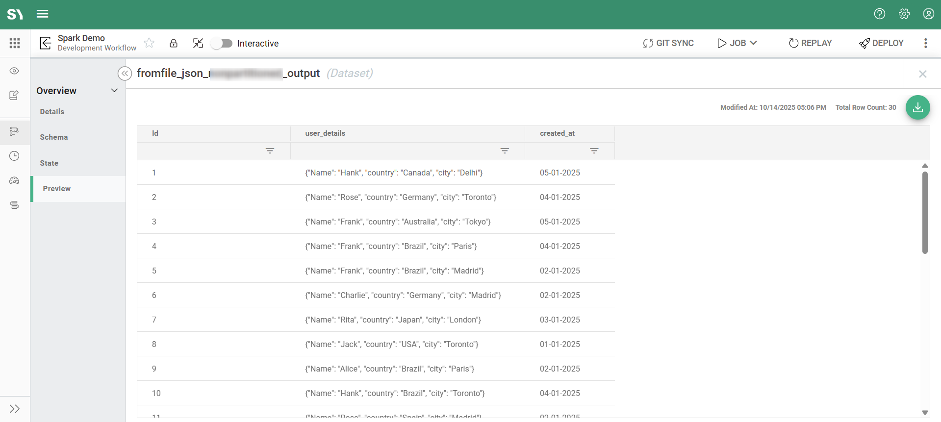 • The processor starts by reading data from an input Event Store using spark.sql("SELECT * FROM @InputTable1"). The dataset includes a column named user_details containing JSON strings.