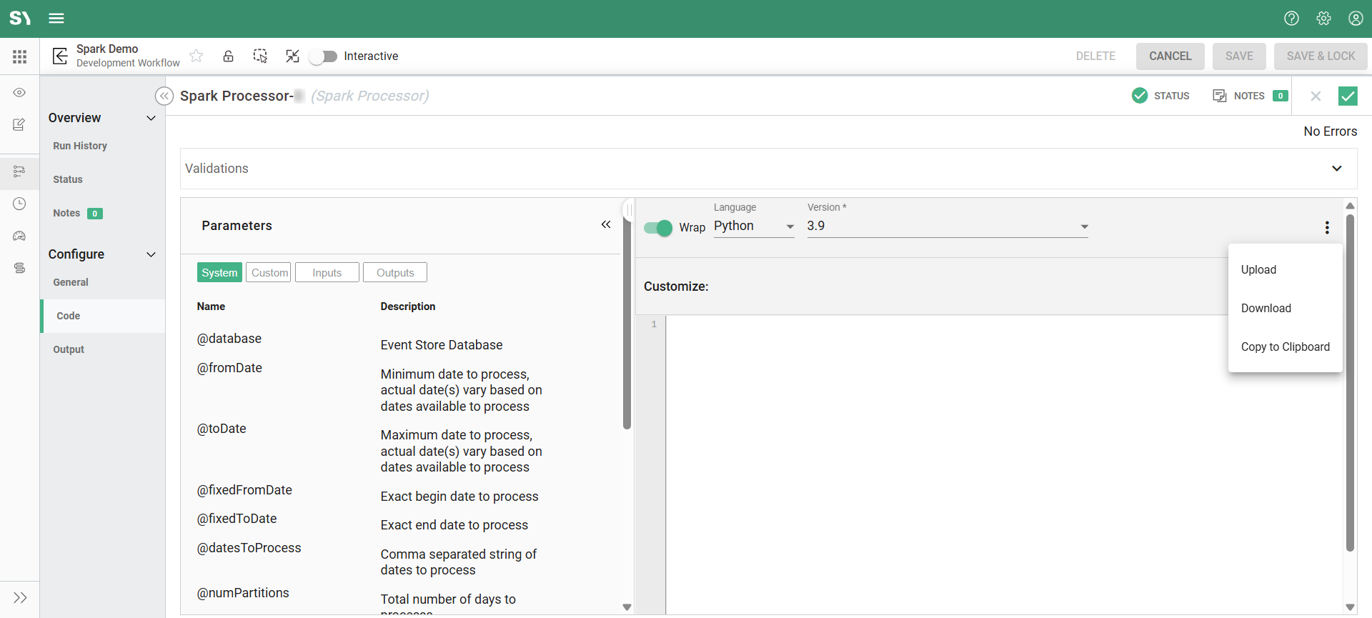 @InputTable1,@OutputTable1, and custom variables directly in your code. These parameters dynamically link to datasets or configuration values defined within the processor. - Upload Code: Allows you to upload a code file (for example,