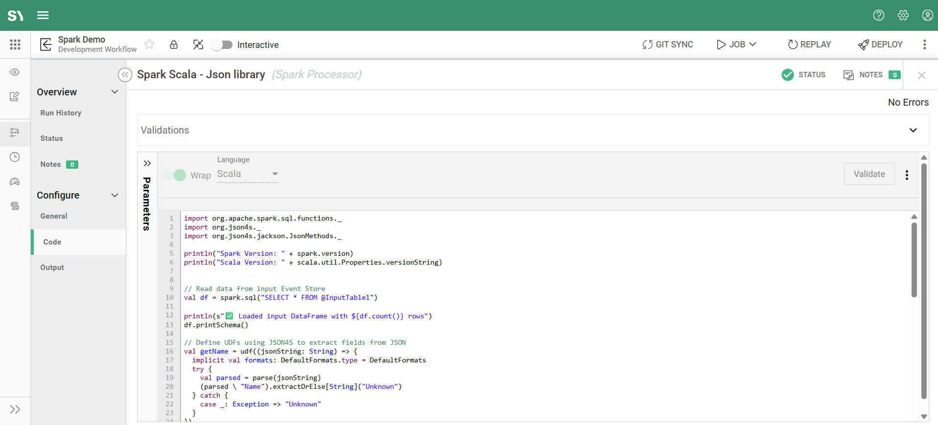 - Code Validation: Before execution, you can validate the Scala code to catch compile-time errors. This feature helps prevent job failures due to syntax or type issues.