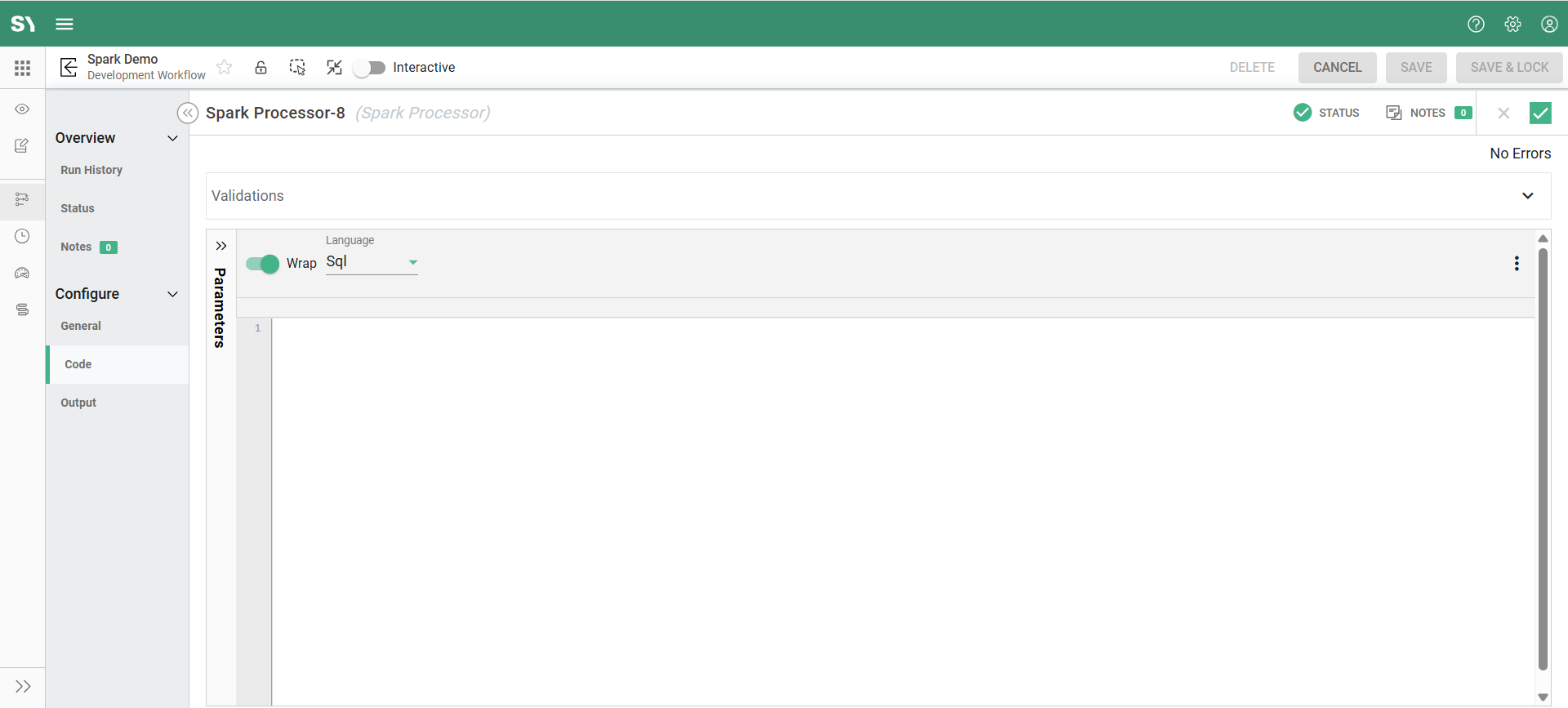 The Code screen is where users write, upload, and manage their Spark code. It supports multiple programming languages and SQL, offering flexibility for data engineers and analysts to choose their preferred language for data transformation.
