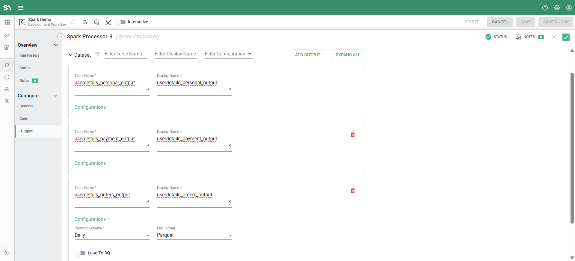 Spark Processor allows you to configure and write to multiple output datasets within the same processor. This is particularly useful when you want to split a single source dataset into multiple logical tables.