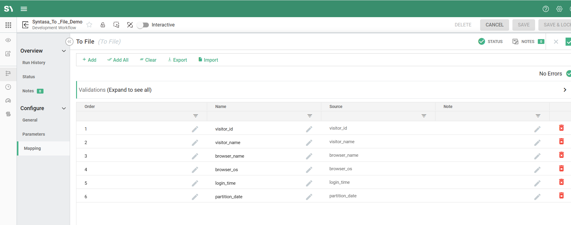 The Mapping screen in the TO FILE process allows users to control which columns are included in the output file and how they appear. This screen is essential for customizing the structure and order of your exported data. By selecting only the relevant columns, renaming them, and setting their order, users can format output files to match specific business or integration requirements.